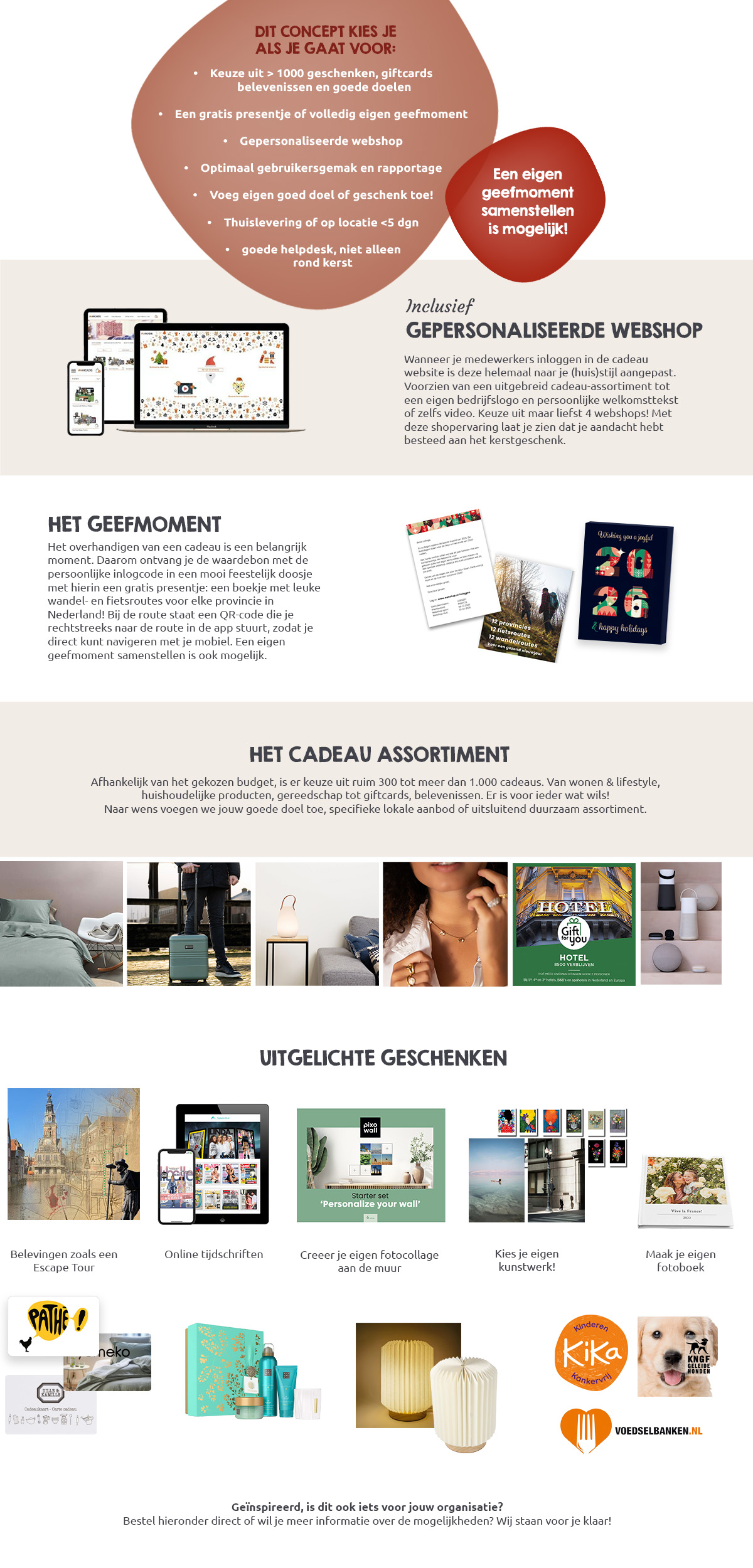 Met ons duurzame eigen keuzeconcept verras jij je collega’s op originele wijze. Online kiezen ze zelf een kerstgeschenk uit een ruim assortiment, in het gewenste budget. Volledig gepresenteerd in je eigen huisstijl. Inclusief (gepersonaliseerde) giftbox met waardebon/kaart en presentje. Vraag hieronder direct vrijblijvend een demoshop aan!