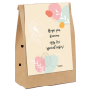 De geschenkzak wordt standaard geleverd met een A6 labelkaart uit het thema 'voorjaar' (diverse soorten). De kaart is te personaliseren dmv het plaatsen van logo en/of tekst op het bestaande artwork of je kunt kiezen voor een volledig eigen kaart.