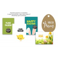 1. Wij plaatsen je logo en/of tekst op een van de kaartdessins uit onze collectie, bv Fijne pasen, vrolijk pasen. Vraag ons naar andere lente- en paasdessins.